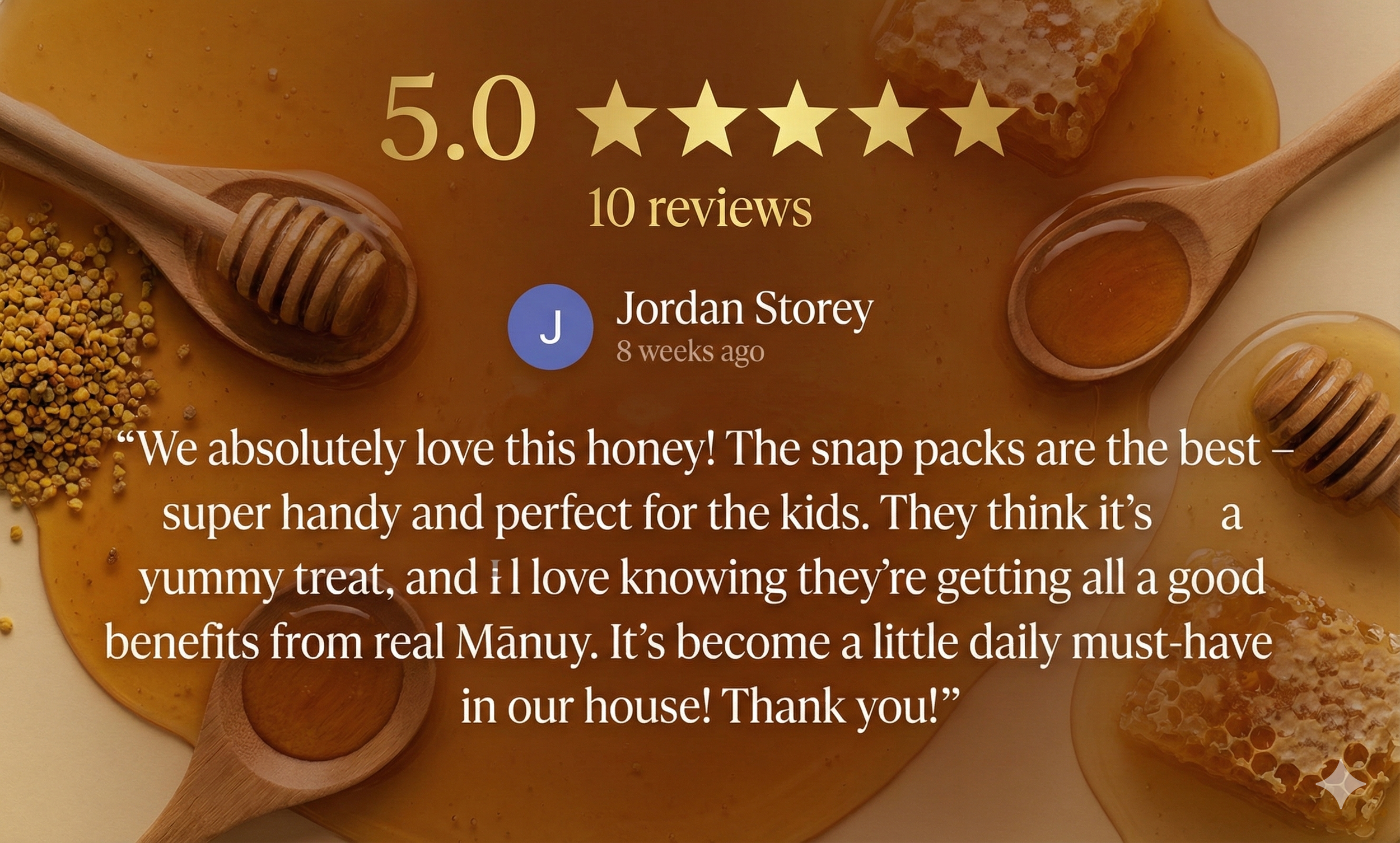 "We absolutely love this honey! The snap packs are the best – super handy and perfect for the kids. They think it’s a yummy treat, and I love knowing they’re getting all the good health benefits from real Mānuka honey. It’s become a little daily must-have in our house!"