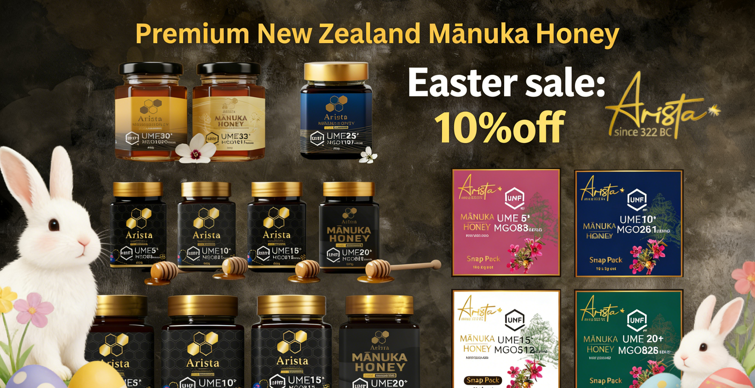 This Easter, treat yourself and your loved ones to the best of New Zealand’s Mānuka honey— at a special price! Enjoy 10% OFF SITEWIDE on our entire range of UMF™ Certified Mānuka honey, including our popular Arista Mānuka honey jars (250g, 500g) and convenient single-serve snap packs.